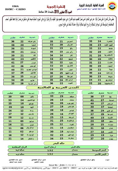 بيان الهيئة العامة للأرصاد الجوية بحالة الطقس اليوم السبت 5 أكتوبر 2019 ودرجات الحرارة في مصر والمدن والعواصم العربية والأجنبية