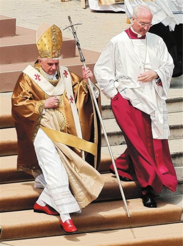 ومن بين الرموز الدينية المضافة، "نعل أحمر" يشير إلى الأحذية الحمراء التقليدية التي يرتديها البابا، والمسيح الصلوب على الأربطة.