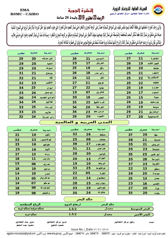 بيان الأرصاد عن أحوال الطقس اليوم الاربعاء 23-10-2019 في مصر، ودرجات الحرارة اليوم في محافظات ومدن جمهورية مصر العربية، ودرجات الحرارة اليوم في بعض المدن والعواصم العربية والأجنبية: