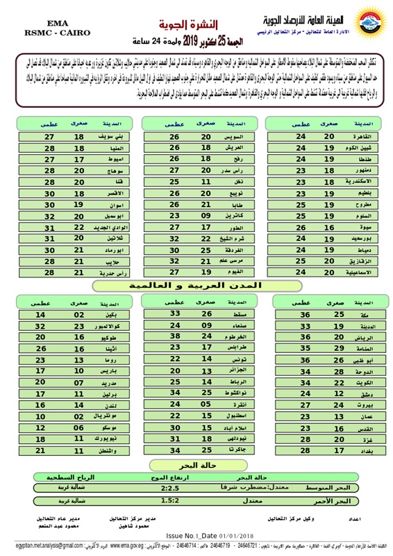 بيان الهيئة العامة للأرصاد الجوية عن حالة الطقس غدًا الجمعة 25/10/2019 في مصر، ودرجات الحرارة في مدن ومحافظات جمهورية مصر العربية وبعض المدن والعواصم العربية والأجنبية: