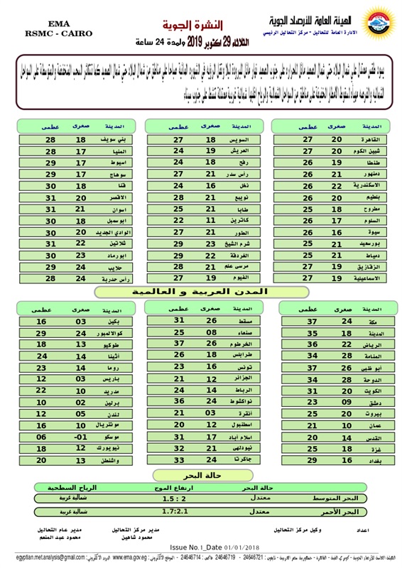 بيان هيئة الأرصاد الجوية عن حالة الطقس اليوم الثلاثاء 25 أكتوبر 2019 في مصر، ودرجات الحرارة اليوم في مدن ومحافظات جمهورية مصر العربية وبعض المدن والعواصم العربية والأجنبية: