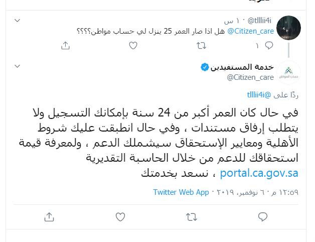 أوضح حساب المواطن العمر المسموح للتسجيل في دعم البرنامج، حيث ورد لصحفة "حدمة المستفيدين" التابعة لحساب المواطن عبر "تويتر" استفسار من مواطن بهذا الشأن حيث قال: "هل اذا صار العمر 25 ينزل لي حساب مواطن؟".