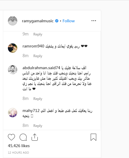 وعلقت إحدى جمهور رامي جمال: "ربنا يشفيك ويصبرك بس متزعلش احنا بنحبك عشانك انت مش عشان شكلك عشان قلبك اليطب وصوتك الحلو ربنا يوفقك ويا فنان احنا معاك وبنحبك".