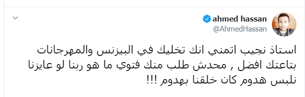 كما هاجم النجم أحمد حسن، عميد لاعبي العالم، تصريحات نجيب ساويرس حيث غرّد على صفحته على "تويتر" قائلًا: "استاذ نجيب اتمنى انك تخليك في البيزنس والمهرجانات بتاعتك افضل، محدش طلب منك فتوى، ما هو ربنا لو عايزنا نلبس هدوم كان خلقنا بهدوم!!!".