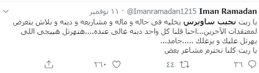 وغرّد شخص أخر قائلًا: "يا ريت يا نجيب ساويرس يخليه في حاله وماله ومشاريعه ودينه وبلاش يتعرض لمعتقدات الآخرين... احنا قلنا كل واحد دينه غالي عنده.. هتهرتل هييجي اللي يرهتل عليك ويزعلك جامد.. يارب كلنا نخترم مشاعر بعض".