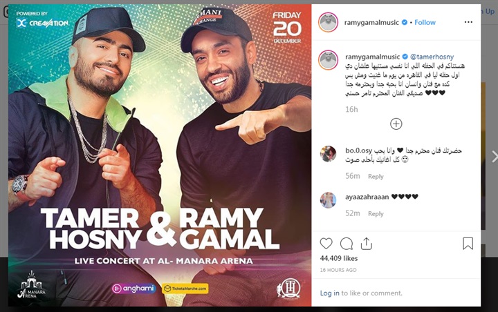 وقال رامي جمال على عبر منشوره: "هنستناكم في الحفلة اللي أنا نفسي مستنيها علشان دي أول حفلة ليا في القاهره من يوم ما غنيت ومش بس كده مع فنان وانسان انا بحبه جدا وبحترمه جدا صديقي الفنان المحترم تامر حسني".