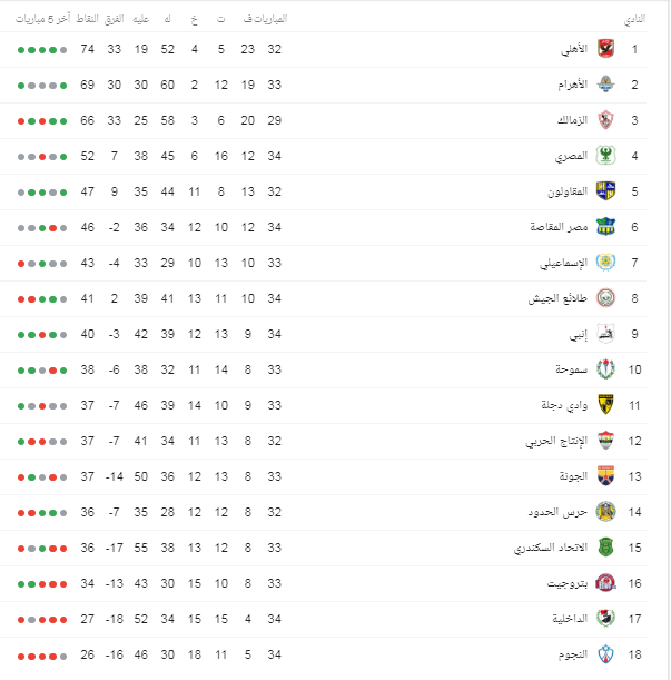 ترتيب جدول الدوري المصري الممتاز في ليلة رأس السنة الميلاية 2020