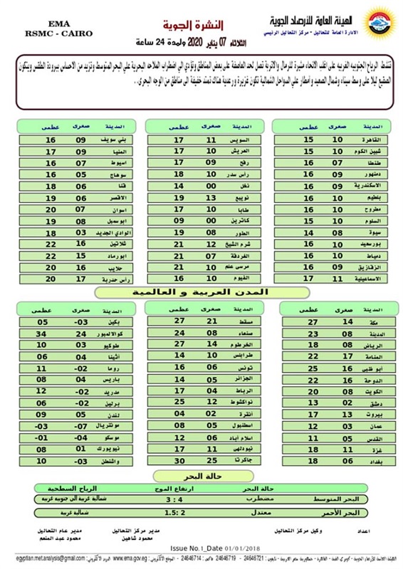 قالت هيئة الأرصاد الجوية إن حالة الطقس اليوم الثلاثاء، تشهد سقوط أمطار غزيرة ورعدية علي السواحل الشمالية ومناطق من الوجه البحري، مع تكون الصقيع علي وسط سيناء وشمال الصعيد، بينما تنشط الرياح الجنوبية الغربية وتكون مثيرة للرمال والأتربة تصل إلى حد العاصفة أحيانا، وتزيد من الاحساس ببرودة الطقس.