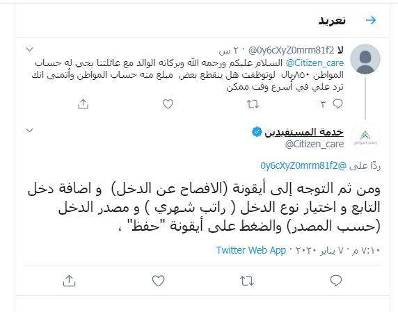 استقبلت صفحة "خدمة المستفيدين" التابعة لبرنامج حساب المواطن على موقع "تويتر"، استفسارًا هامًا بشأن تغيير دخل احد المستفيدين من العائلة المستحقة من دعم البرنامج، حيث قال: "السلام عليكم ورحمه الله وبركاته الوالد مع عائلتنا يجي له حساب المواطن ٨٥٠ ريال لوتوظفت هل ينقطع بعض مبلغ منه حساب المواطن وأتمنى انك ترد علي في أسرع وقت ممكن".