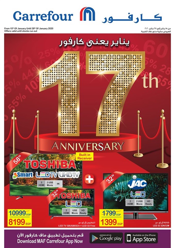 تستمر عروض ماركت كارفور مصر بعد عيد ميلاده السابع عشر إلى يوم 28 يناير 2020، بجميع المحافظات على جميع الأجهزة الكهربائية، وشملت عروض كارفور للشاشات خصومات قوية على أغلب الماركات والمقاسات لتناسب أذواق جميع الجماهير، وأكدت صفحة كارفور أن مجلة عروض كارفور يناير شملت السلع الغذائية ومستلزمات النظافة وجميع الأجهزة المنزلية والكهربائية والمفروشات والملابس الحريمي والرجالي.
