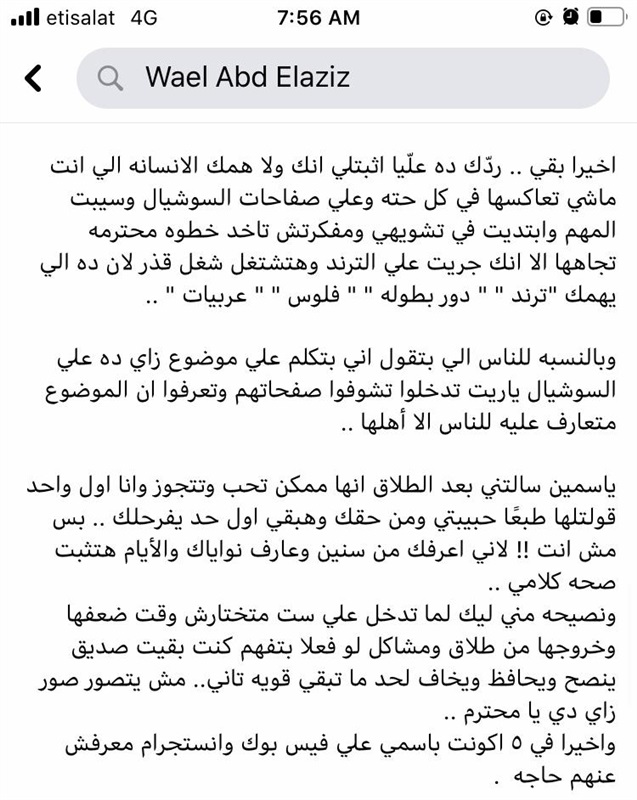 وجه شقيق ياسمين عبد العزيز رسالة هجومية لـ "احمد العوضي"، ليؤكد فيها علاقتهما الغرامية، ويتهم فيها العوضي باستغلال اسم ياسمين وعاتبها بشدة، قائلا: "بصي يا ياسمين يا عبدالعزيز يا أختي، أنا معاكي وفي ضهرك من وأنتِ صغيرة شيلت مشاكل كتيًر بسببك ووقفت جنبك بكل ما أملك من قوة أدافع عنك في كل موقف صعب مر عليكي، ونسيت حياتي ونفسي علشان تبقي نجمة في مجالك، ومن إمتى وإحنا بنعمل أعياد ميلاد وتنزل على السوشيال ميديا، من إمتى الناس بتجيب في سيرتنا!؟ ونقعد نتعاكس على السوشيال ميديا ومع ذلك حياتك وإنتِ حرة فيها، أنا هتكلم على الشق إللى يخصني، إحنا دلوقتي عايزين نفهم العلاقة دي إيه ورايحة على فين؟، أما بالنسبة للأخ اللي ماشي وراكي في كل حتة وشايفك البيضة الدهب إلى هتفقسله كل يوم، أحب أقولك يا راجل لما تيجي تدخل بيت تدخله من بابه وتقعد مع رجالة البيت!!.. دي الأصول وده الاحترام".