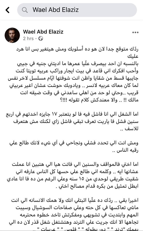 وتابع، قائلًا: "اما الشغل الي انا فاشل فيه فا لو بتعتبر ١٧ جايزه اخدتهم في اربع سنين فشل فا ياريت تعرف تبقي فاشل زاي لكنك مش هتعرف للاسف..ومش انت الي تحدد فشلي ونجاحي في اَي شيء لانك طالع على رقبه الناس، اما اختي فالمواقف والسنين الي فاتت هيا الي هتبين انا عملت عشانها ايه.. وكلمه اني طالع على حسها كل الناس عارفه اني شقيت طريقي لوحدي من ١٥ سنة وعلي الرغم من ده فا انا عادي ابطل تمثيل من بكره قدام مصالح اختي اخيرا بقي.. ردّك ده علّيا اثبتلي انك ولا همك الانسانه الي انت ماشي تعاكسها في كل حته وعلي صفحات السوشيال وسيبت المهم وابتديت في تشويهي ومفكرتش تاخد خطوه محترمه تجاهها الا انك جريت على الترند وهتشتغل شغل قذر لان ده الي يهمك "ترند" دور، بطوله، فلوس، عربيات".