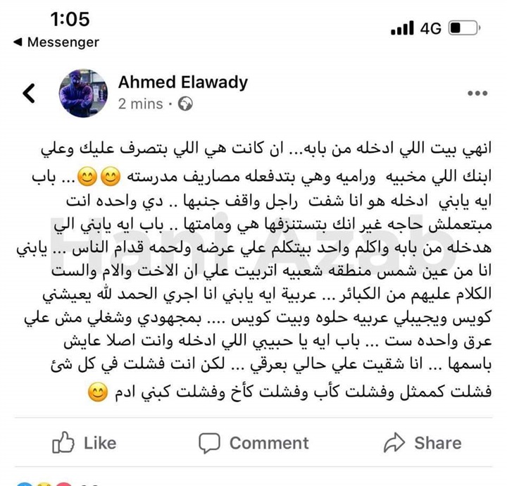 وبعد الهجوم عليه قرر احمد العوضي الرد على شقيق ياسمين عبدالعزيز، بنشر بوست على موقع التواصل الاجتماعي "فيسبوك"، قائلًا: "انهى بيت اللى ادخله من بابه.. ان كانت هي اللى بتصرف عليه وعلى ابنك اللي مخبيه وراميه وهي بتدفعله مصاريف مدرسته.. باب ايه يا ابنى ادخله هو انا شفت راجل واقف جنبها.. دي واحدة انت مبتعملش حاجة غير أنك بتستنزفها هي ومامتها.. باب ايه يا ابنى الى هدخله من بابه واكلم واحد بيتكلم على عرضه ولحمه قدام الناس.. يا ابنى انا من عين شمس منطقة شعبية اتربيت على ان الأخت والام والست الكلام عليهم من الكبائر.. عربية ايه يا ابنى انا اجرى الحمد لله يعيشني كويس ويجيبلي عربية حلوة وبيت كويس.. بمجهودي وشغلي مش على عرق واحدة ست.. باب ايه يا حبيبي اللي ادخله وانت أصلا عايش باسمها.. انا شقيت على حالي بعرقي.. لكن انت فشلت في كل شيء فشلت كممثل وفشلت كأب وفشلت كأخ وفشلت كبنى ادم".