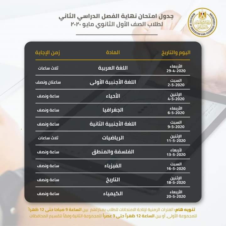 جدول امتحانات الصف الاول الثانوي الترم الثاني