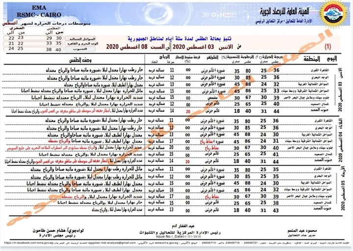 أعلنت الهيئة العامة للأرصاد الجوية عن طقس الثلاث أيام المقبلة بدءاً من الأثنين ٣ أغسطس حتى الأربعاء ٥أغسطس٢٠٢٠.