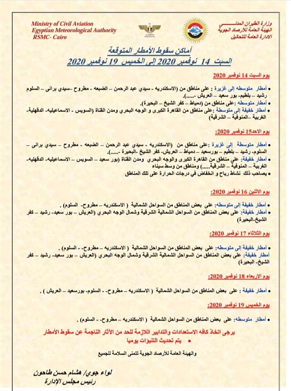 وكشفت الهيئة عن أماكن سقوط الأمطار المتوقعة بدءًا من غدا السبت 14 نوفمبر 2020 ولمدة أسبوع حتى يوم الخميس 19 نوفمبر 2020.