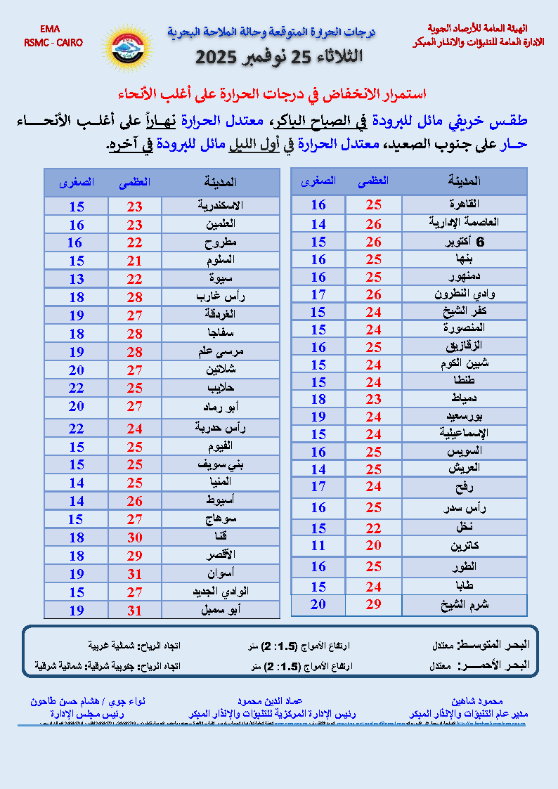 من جانبه، كشف مدير مركز التحاليل والتنبؤات بهيئة الأرصاد الجوية، الدكتور محمود شاهين، عن تطورات الطقس غدا الخميس والتي ستكون مستقرة إلى حد كبير ولاسيماً فب حركة الأمواج.