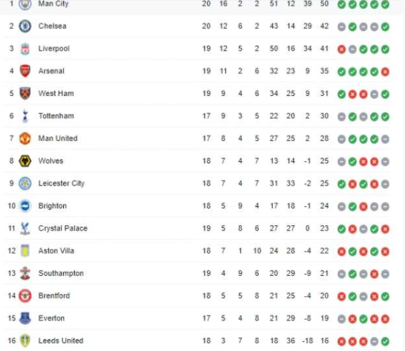 ويأتي يدز يونايتد برصيد 16 نقطة، أما واتفورد يأتي في المركز الـ17 برصيد 13 نقطة، ويأتي بيرنلي في المركز الـ18 برصيد 11 نقطة، أما نيوكاسل فيكون في لمركز قبل الأخير، وونيورتش سيتي يأتي في المركز الأخير برصيد 10 نقاط.