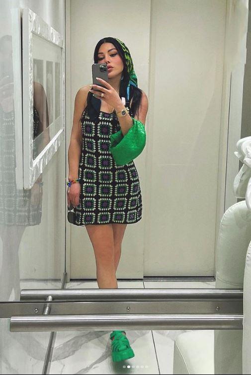 ظهرت الفنانة هيفاء وهبي بإطلالة جريئة؛ حيث اعتمدت هيفاء على اللون الأخضر بدرجاته في إطلالاتها، إذ أنها ارتدت فستانًا قصيرًا من اللون الأسود من الكروشيه يحتوي على مربعات مزركش بالألوان الأخضر والأصفر، وكان أبرز ما لفت الانتباه إلى إطلالة هيفاء وهبي هو تركها شعرها الناعم ينسدل على كتفها وربط وشاحا صغيرًا احتوى على اللون الأخضر على رأسها (إيشارب)، كما نسقت إطلالتها ايضا بشنطة وحذاء باللون الأخضر.