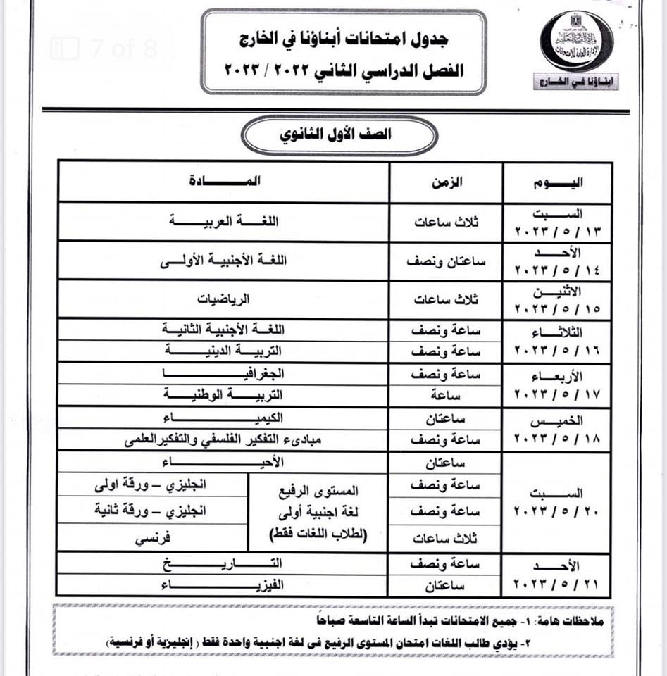 تبعًا لوزارة التربية والتعليم، من المقرر أداء امتحانات الصف الأول الثانوي المصريين في الخارج بداية من يوم السبت 13 مايو وحتى الأحد 21 مايو لعام 2023، حيث جاء الجدول كالتالي: