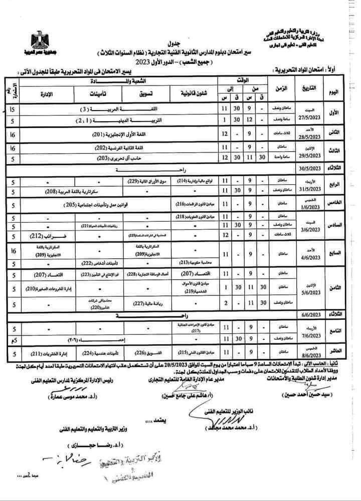 جدول امتحانات الدبلومات الفنية 2023 دبلوم المدارس الثانوية الفنية التجارية