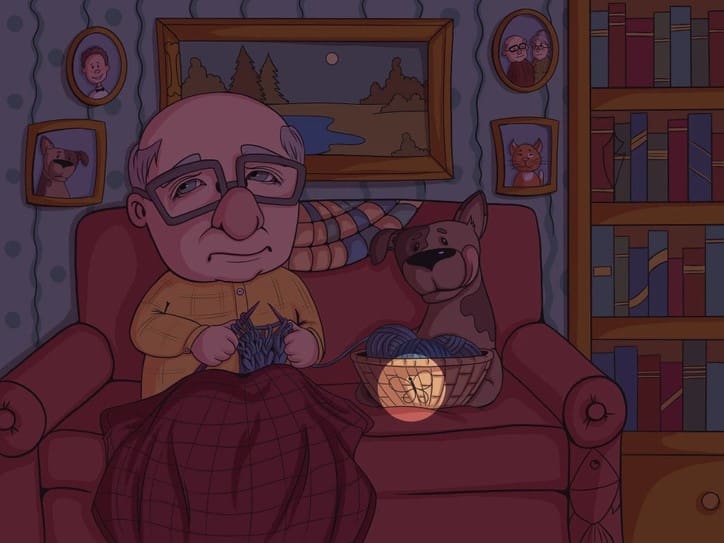 نرى هنا صورة مأخوذة من غرفة معيشة الجد، وهو يجلس على الأريكة وبجانبه كب لطيف، يحاول الجد نسج شيء ما من كرة الصوف، ويوجد خلفه مكتبة وبعض الصور المعلقة على الحائط، ولكن دعنا من هذا كله، المطلوب منك الآن هو البحث عن فراشة تختبئ في هذه الصورة، لديك خمس ثوان فقط لكي تعثر عليها، إنه وقت قصير لكنه كافٍ.