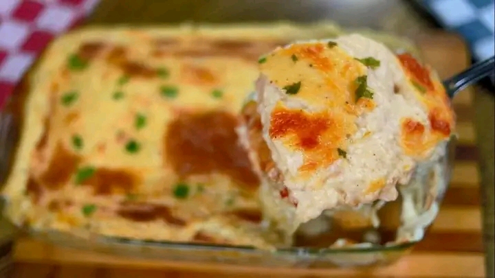 وفي وعاء مناسب يجب إضافة الزبدة والدقيق والقليب لمدة دقيقة ثم إضافة الحليب بالتدريج مع التقليب المستمر للحصول على بشاميل كريمي وتحضير صينية وإضافة طبقة من المكرونة ثم إضافة طبقة من قطع الدجاج ثم طبقة أخرى من المكرونة وإضافة البشاميل ثم إضافة الجبنة وإدخال الصينية الفرن لمدة 15 دقيقة وتقدم ساخنة.
