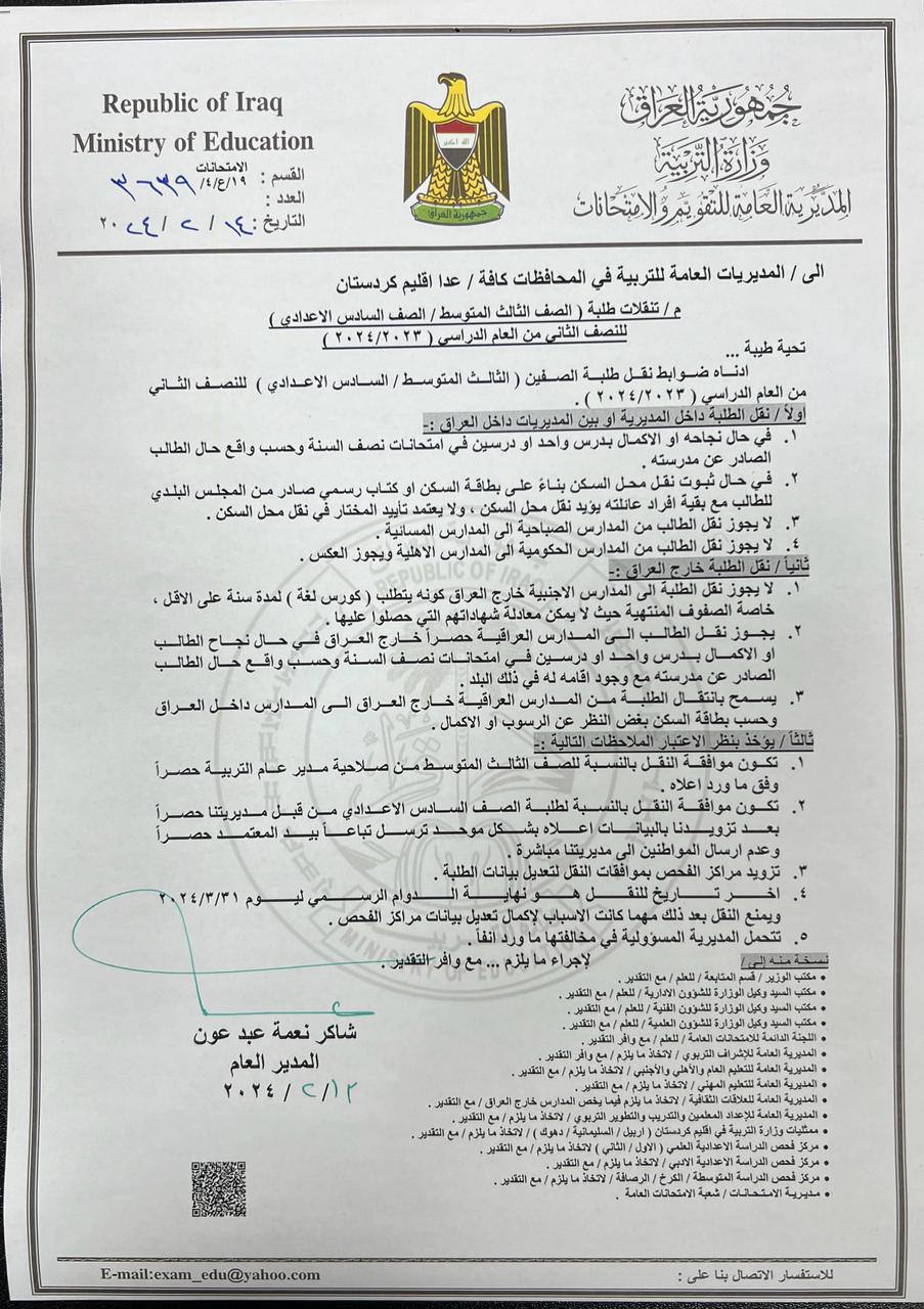 يتعين على الطلاب في الصفوف المنتهية (الثالث المتوسط والسادس الإعدادي) اتباع الشروط التالية للنقل داخل العراق: