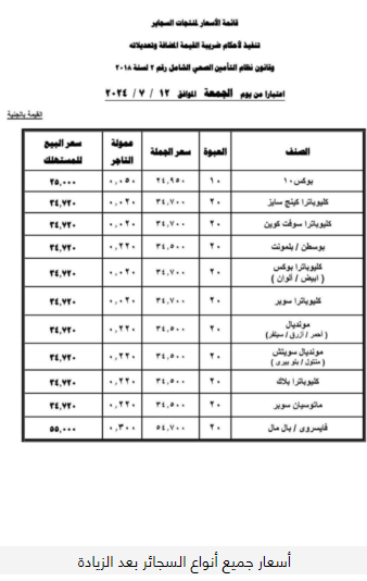 كذلك، شهدت سجائر كليوباترا سوفت كوين وكليوباترا بوكس (أبيض/ألوان) ارتفاعًا إلى 34.72 جنيه بدلًا من 34.50 جنيه.