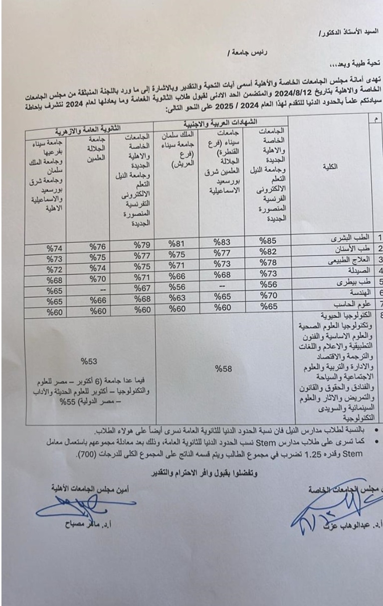 - كلية الطب البشري: الحد الأدنى للقبول هو 79% في الجامعات الخاصة والأهلية وجامعة النيل، و76% في جامعتي الجلالة والعلمين الدولية، و74% في جامعات سيناء والملك سلمان الدولية وشرق بورسعيد الأهلية والإسماعيلية الأهلية الجديدة.