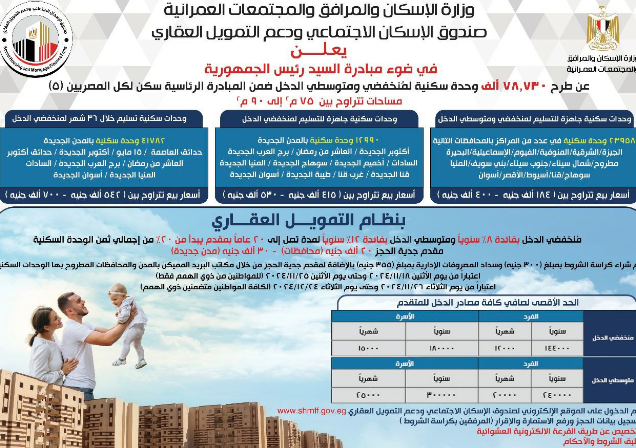 كما أضافت عبد الحميد أن الأسعار الخاصة بالوحدات الجاهزة والمتاحة للمواطنين منخفضي ومتوسطي الدخل تبدأ من 184 ألف جنيه إلى 400 ألف جنيه في المحافظات، وتصل في المدن الجديدة إلى 530 ألف جنيه، كما يتم توفير وحدات تحت الإنشاء تسلم خلال 36 شهرًا في مدن مثل حدائق العاصمة وحدائق أكتوبر وأكتوبر الجديدة. وتتاح عملية الشراء عبر نظام التمويل العقاري بفائدة 8% لمحدودي الدخل و12% للمتوسطي الدخل، مع فترة تقسيط تصل إلى 20 عامًا، مع حظر الشراء النقدي، حيث يلتزم المتقدمون بنظام التمويل العقاري وفق الشروط المحددة.
