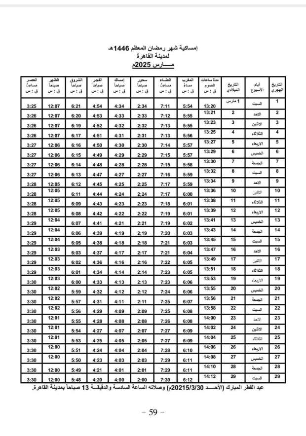 إمساكية شهر رمضان 2025: مواعيد الصلاة ومواقيت الصوم في مصر