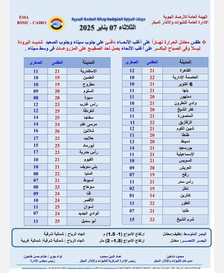 أعلنت الهيئة العامة للأرصاد الجوية عن حالة الطقس ودرجات الحرارة المتوقعة غدًا الثلاثاء 7 يناير 2025، في مختلف أنحاء مصر.
