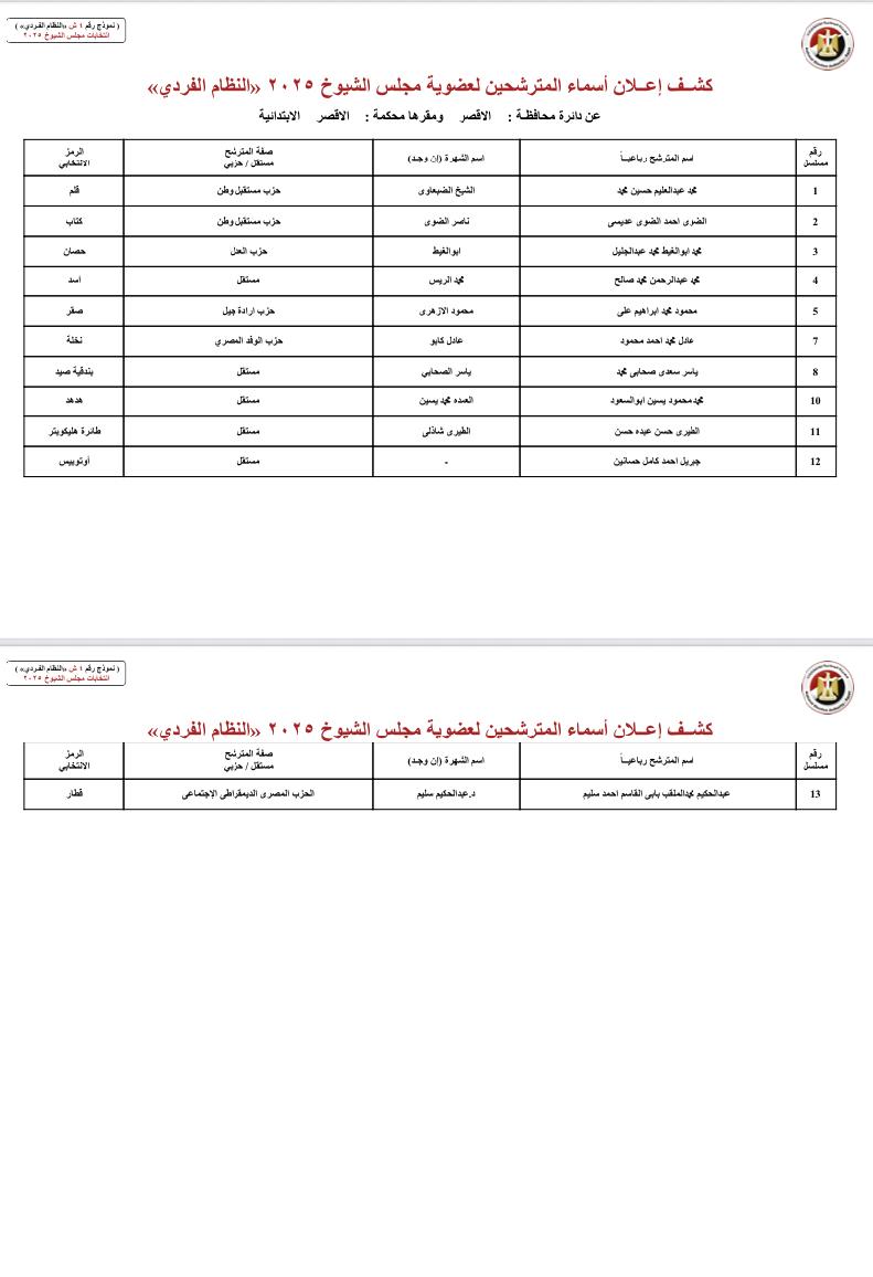 القوائم الكاملة لأسماء ورموز مرشحي انتخابات مجلس الشيوخ 2025 في جميع محافظات مصر