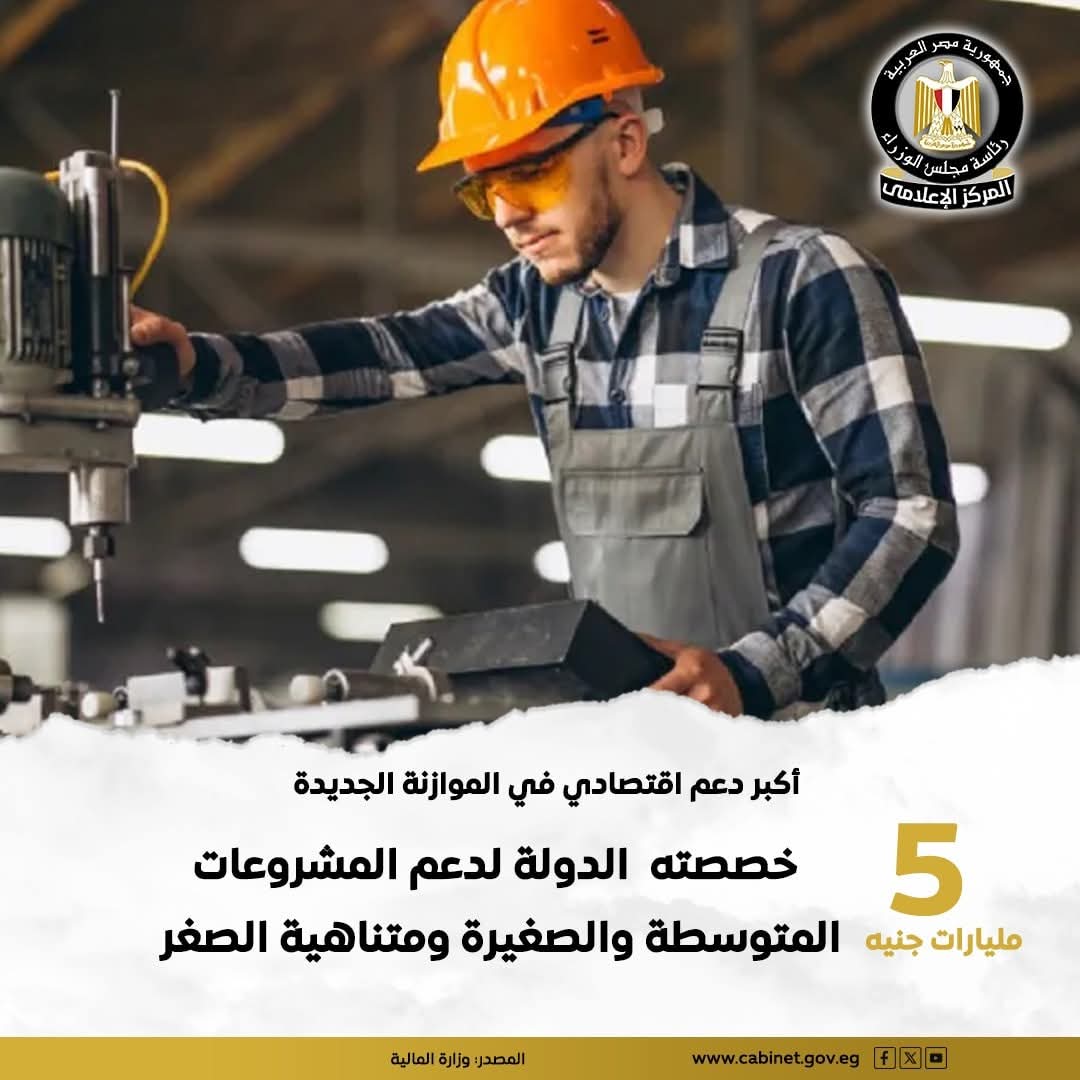 اعتبارًا من يوليو.. الحكومة تطلق أكبر دعم تمويلي للمشروعات الصغيرة والمتوسطة بشراكة استراتيجية لتعزيز النمو الاقتصادي، في خطوة لدعم الاقتصاد الوطني وتعزيز فرص التشغيل، تبدأ الحكومة اعتبارًا من أول يوليو تنفيذ أكبر حزمة دعم اقتصادي موجهة إلى المشروعات المتوسطة والصغيرة ومتناهية الصغر، وذلك ضمن شراكة استراتيجية بين وزارة المالية وجهاز تنمية المشروعات.