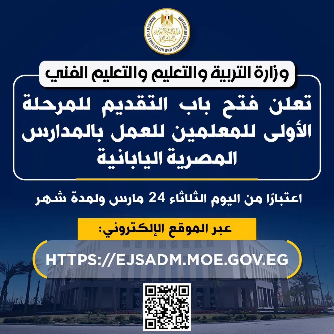 التعليم تعلن فتح باب التقديم للمرحلة الأولى للمعلمين للعمل بالمدارس المصرية اليابانية اعتبارًا من اليوم ولمدة شهر
